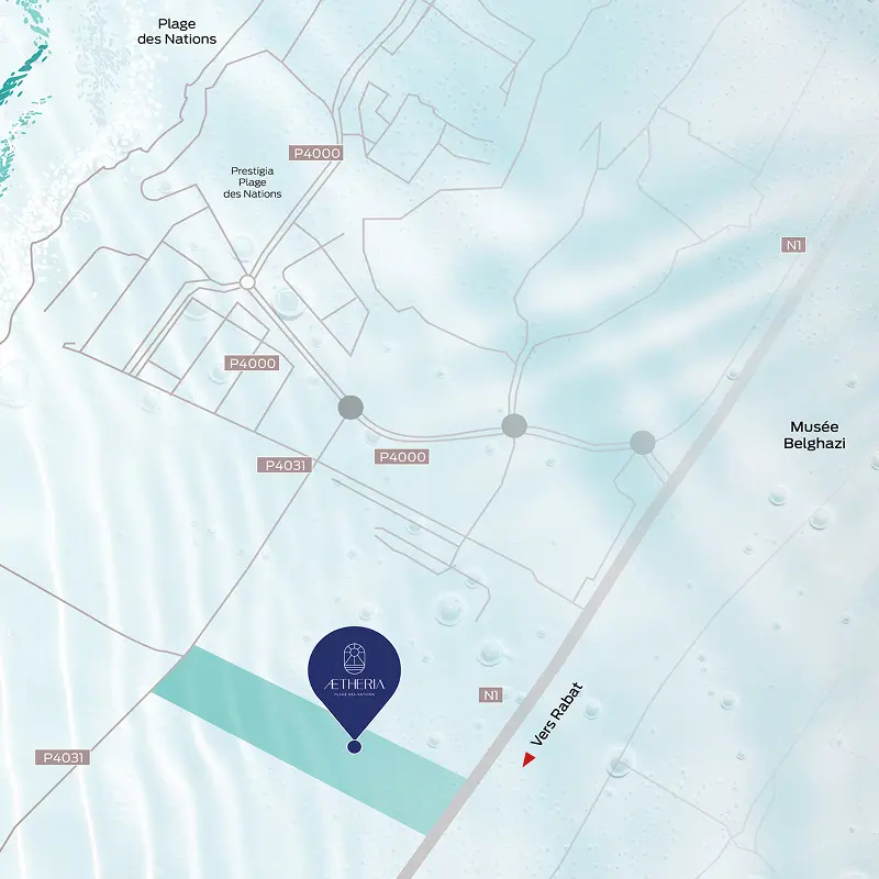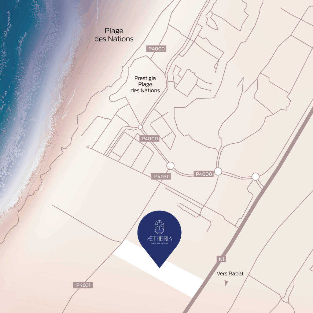 Idéalement situé à 2 minutes de la Plage des Nations, Aetheria est connecté aux grandes voies d’accès tout en restant ancré dans la tranquillité. Écoles, commerces, plage et ville : tout est proche.